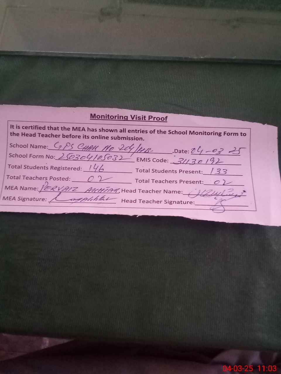 | Attendance Register | Head Teacher | MEA with School | Visit Proof |