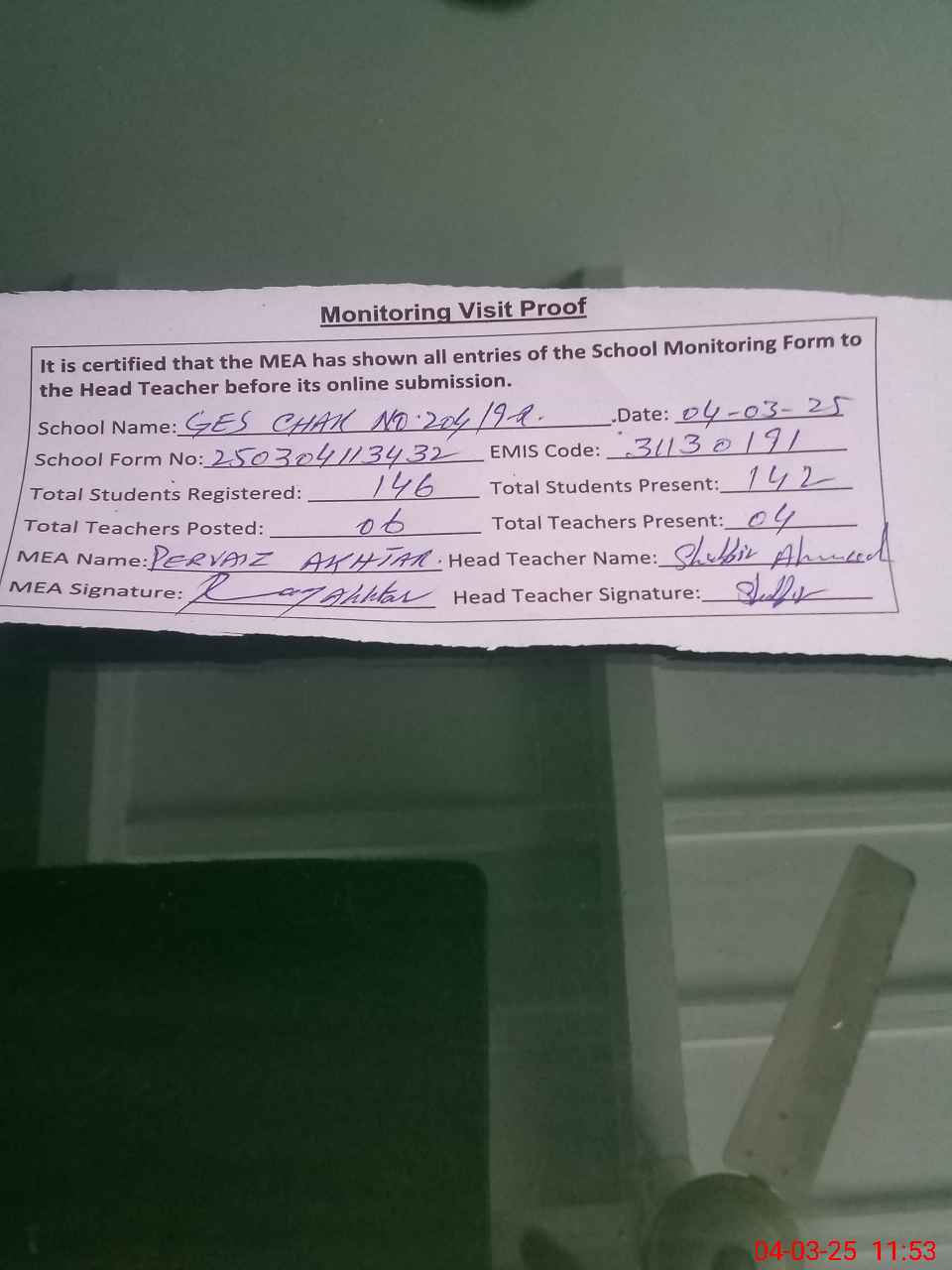 | Attendance Register | Head Teacher | MEA with School | Visit Proof |