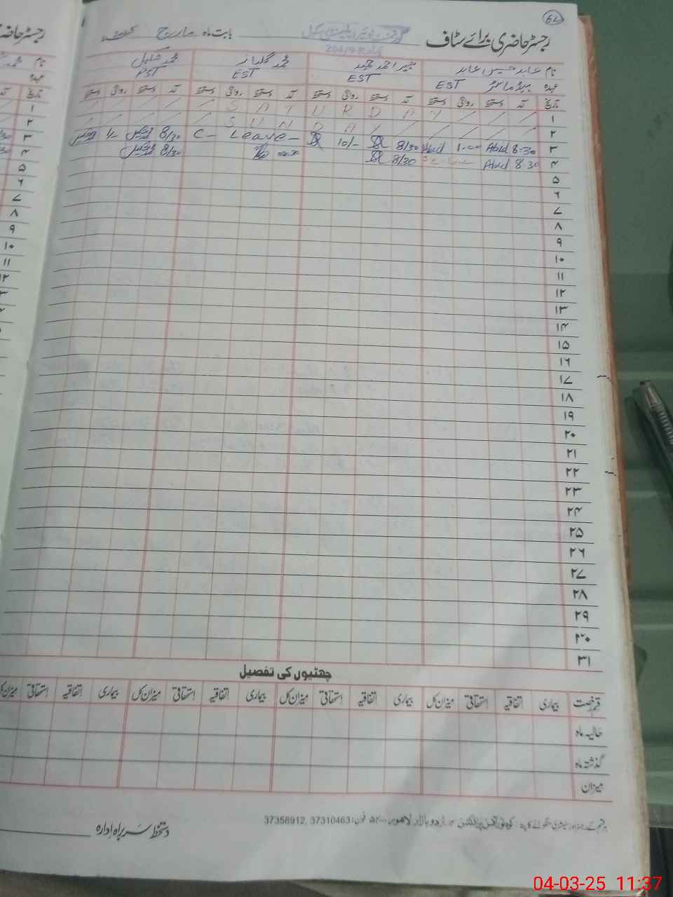 | CNIC | Full Name | Designation | R/C | Absence During Last Calender Month |
