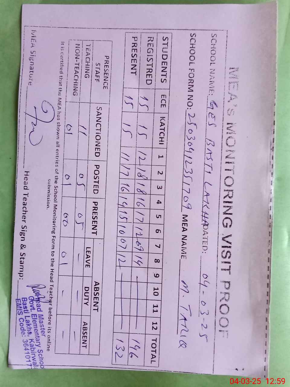 | Attendance Register | Head Teacher | MEA with School | Visit Proof |