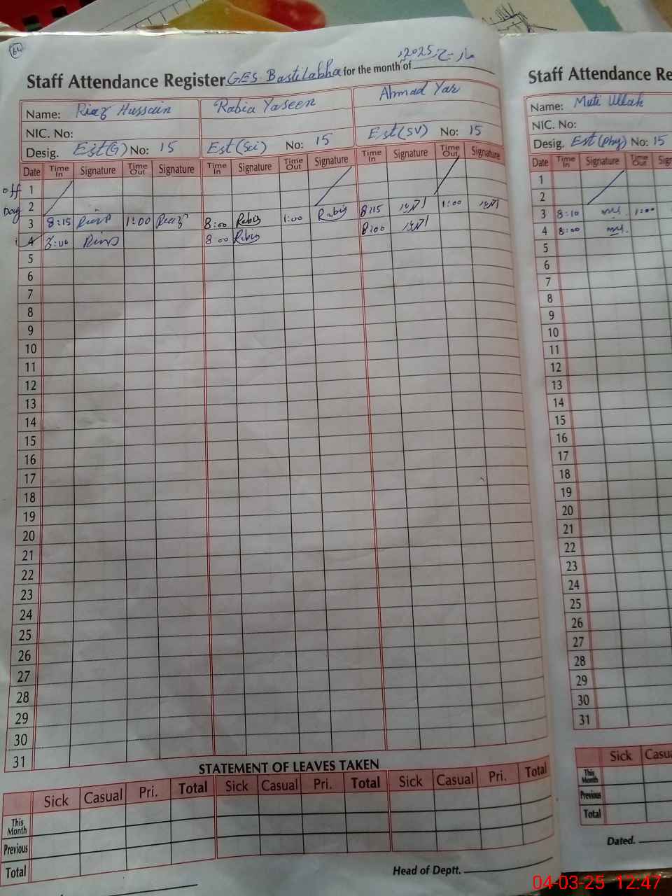 | Leave | Duty | Absent | Maternity | Medical | Ex- Pak |