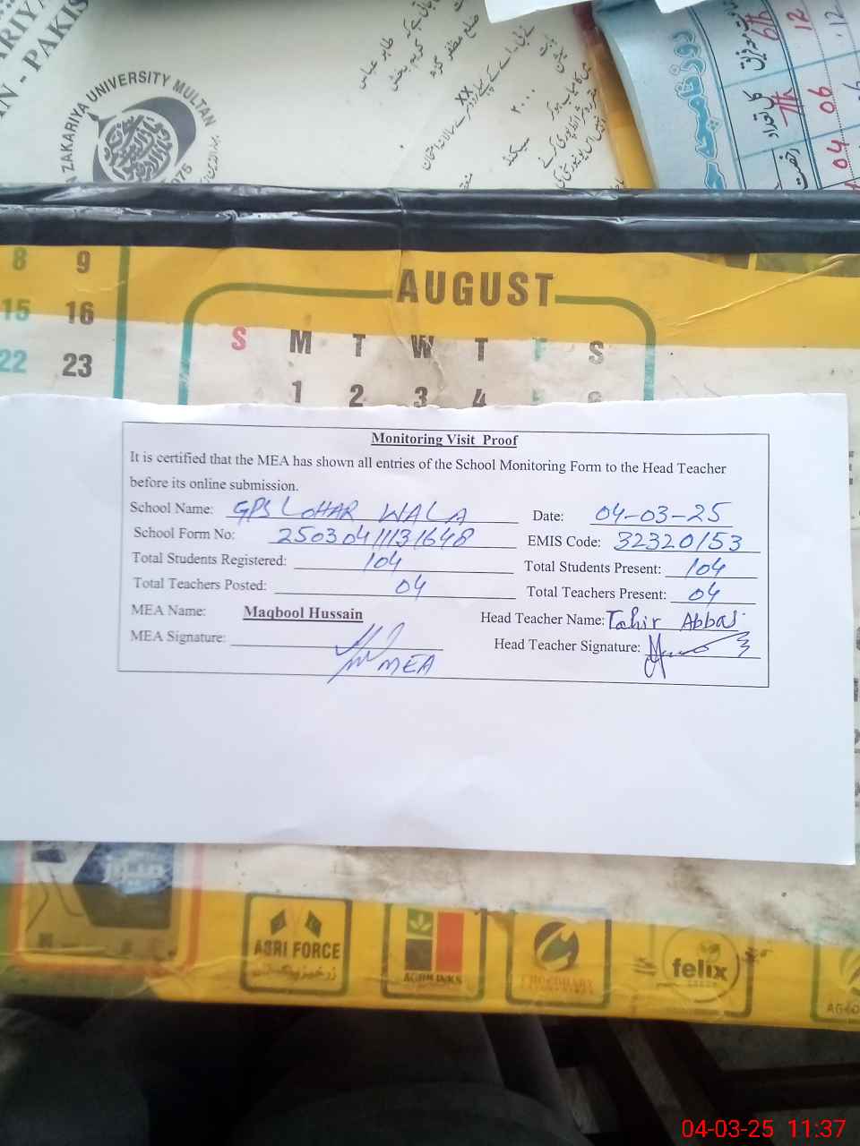 | Attendance Register | Head Teacher | MEA with School | Visit Proof |