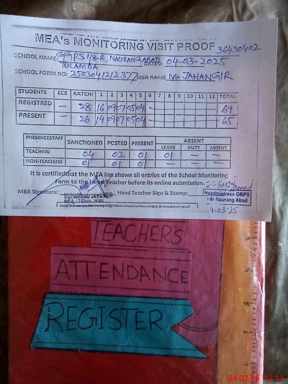| Attendance Register | Head Teacher | MEA with School | Visit Proof |