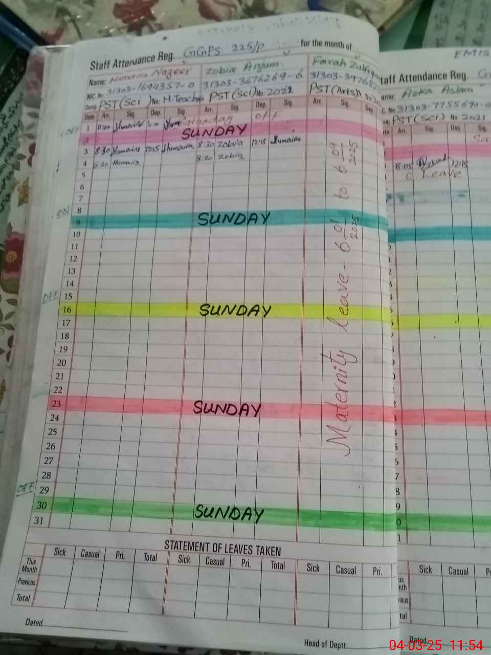 | 31**** | Fa**** Zu**** | PST | Regular | 28 | 0 | 0 | 28 | 0 | 0 | 0 | 0 | 0 | Maternity |
