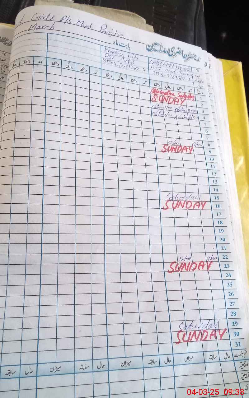 | 31**** | Kh**** BiBi | PST | Regular | 0 | 0 | 0 | 0 | 0 | 0 | 0 | 0 | 0 | Absent (Un-Authorized) |