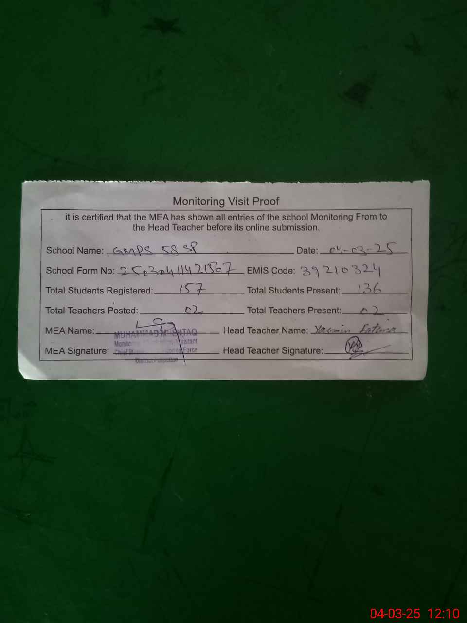 | Attendance Register | Head Teacher | MEA with School | Visit Proof |