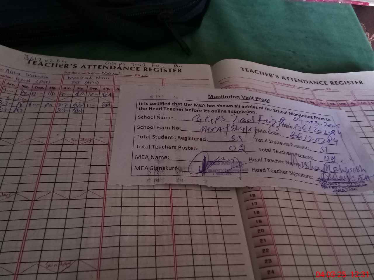 | Attendance Register | Head Teacher | MEA with School | Visit Proof |