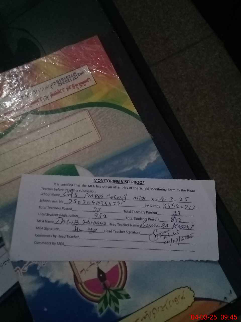 | Attendance Register | Head Teacher | MEA with School | Visit Proof |