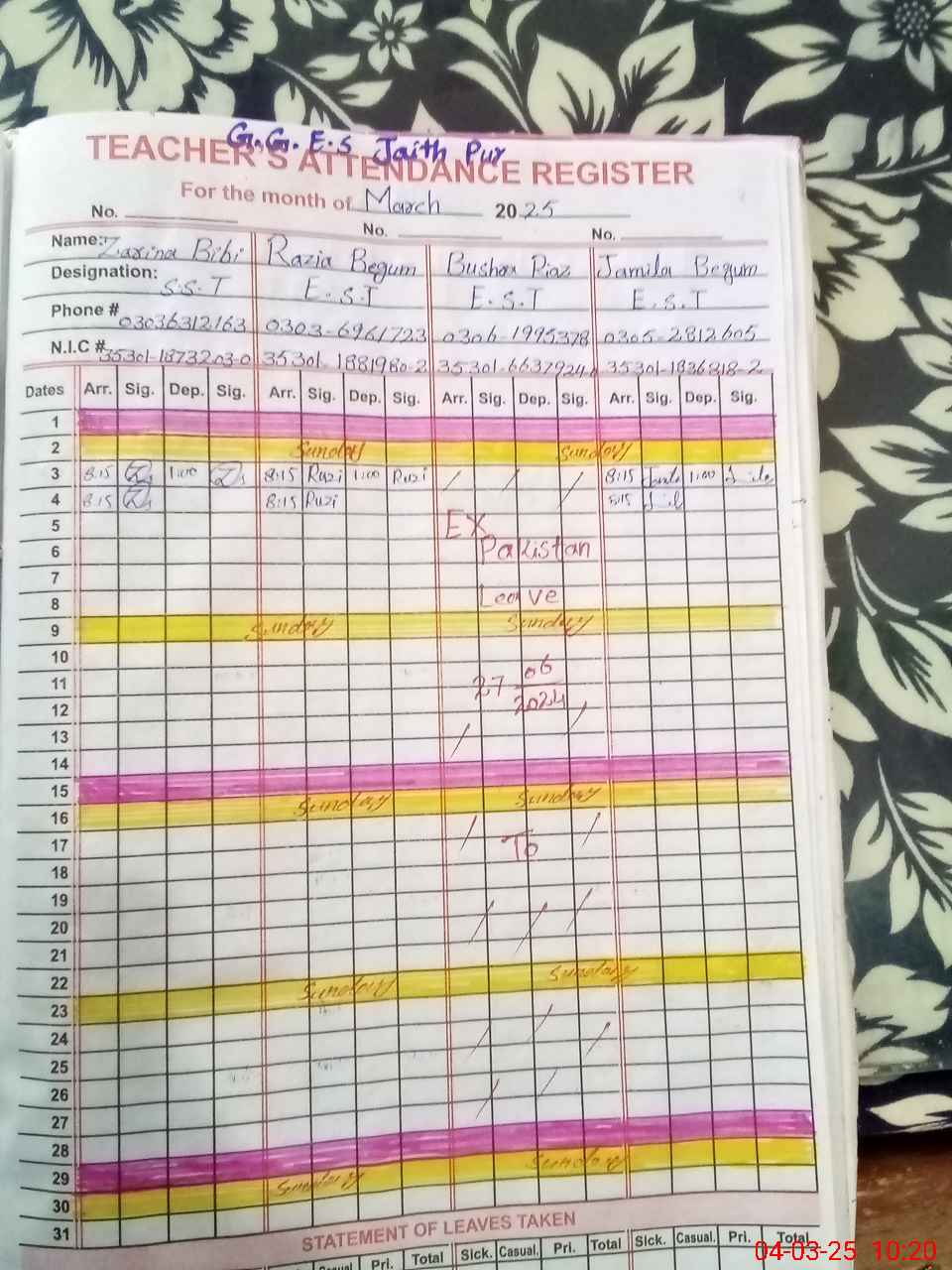 | CNIC | Full Name | Designation | R/C | Absence During Last Calender Month |