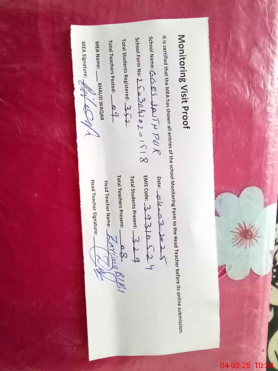 | Attendance Register | Head Teacher | MEA with School | Visit Proof |