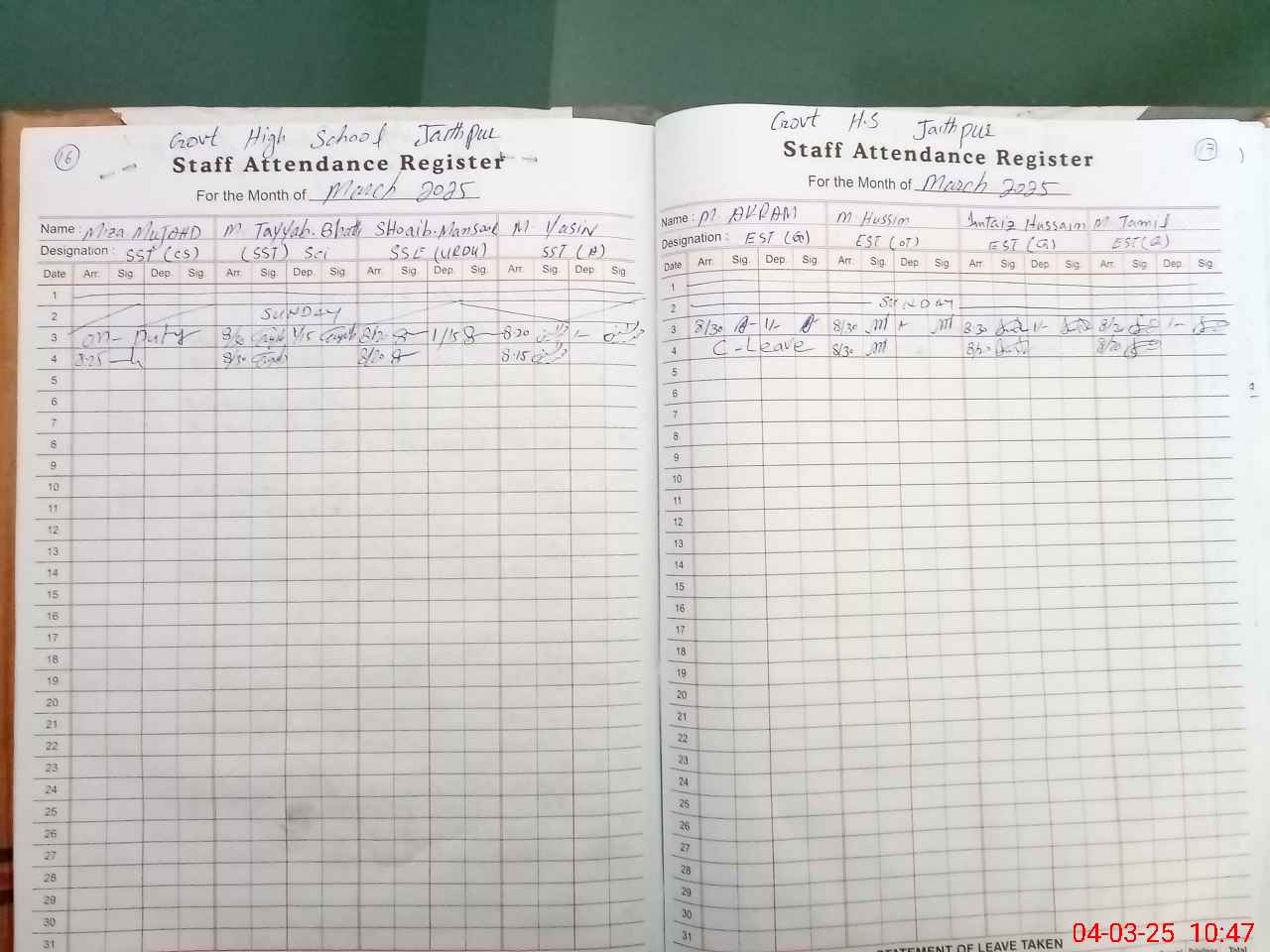 | Leave | Duty | Absent | Maternity | Medical | Ex- Pak |