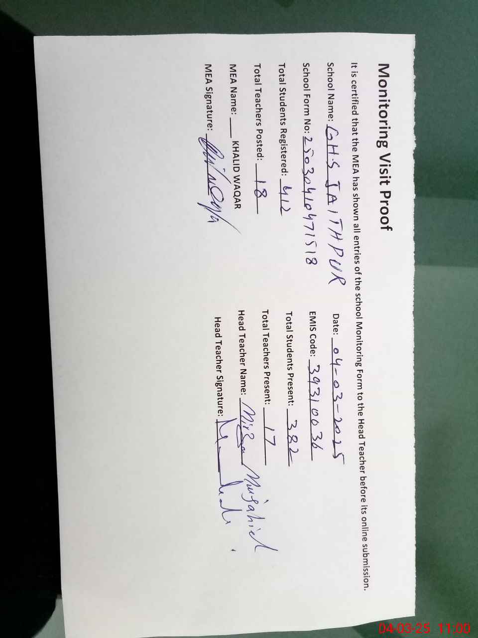 | Attendance Register | Head Teacher | MEA with School | Visit Proof |