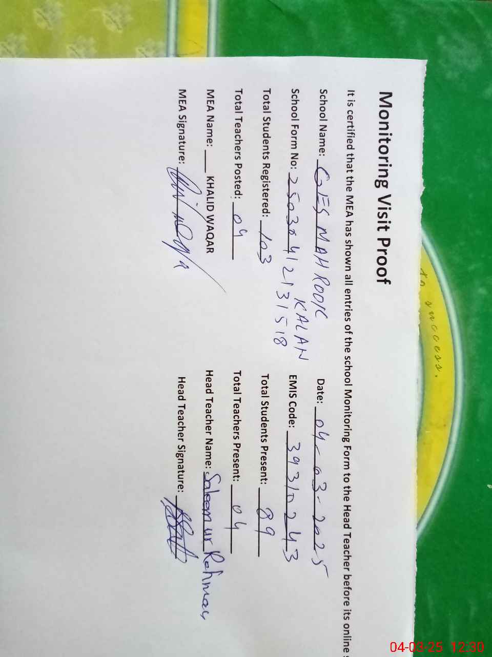 | EMIS Code: 39310243 | Name of School: GES MAHROOK KALAN | |||