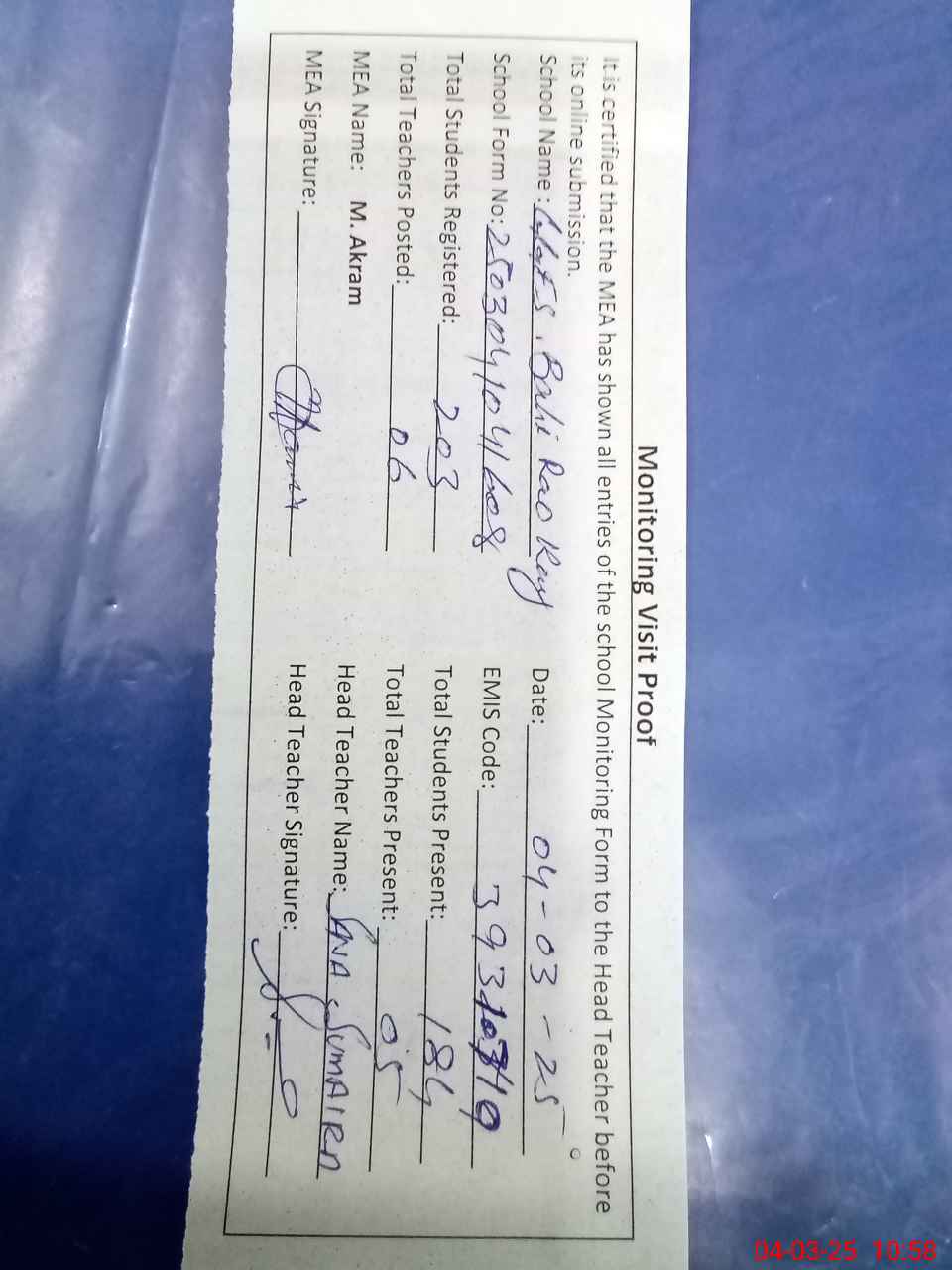 | Attendance Register | Head Teacher | MEA with School | Visit Proof |