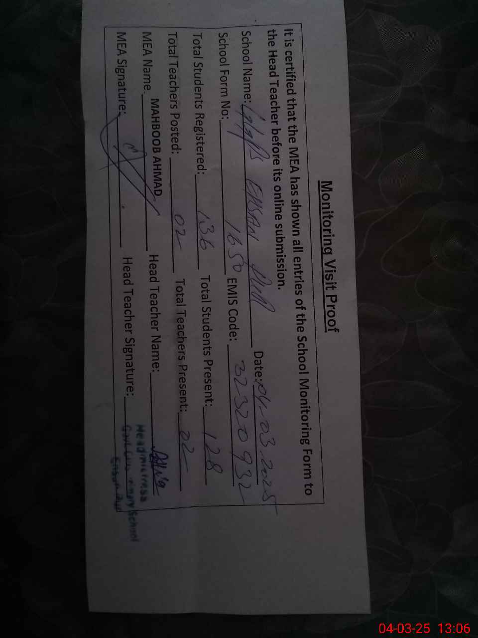 | Attendance Register | Head Teacher | MEA with School | Visit Proof |