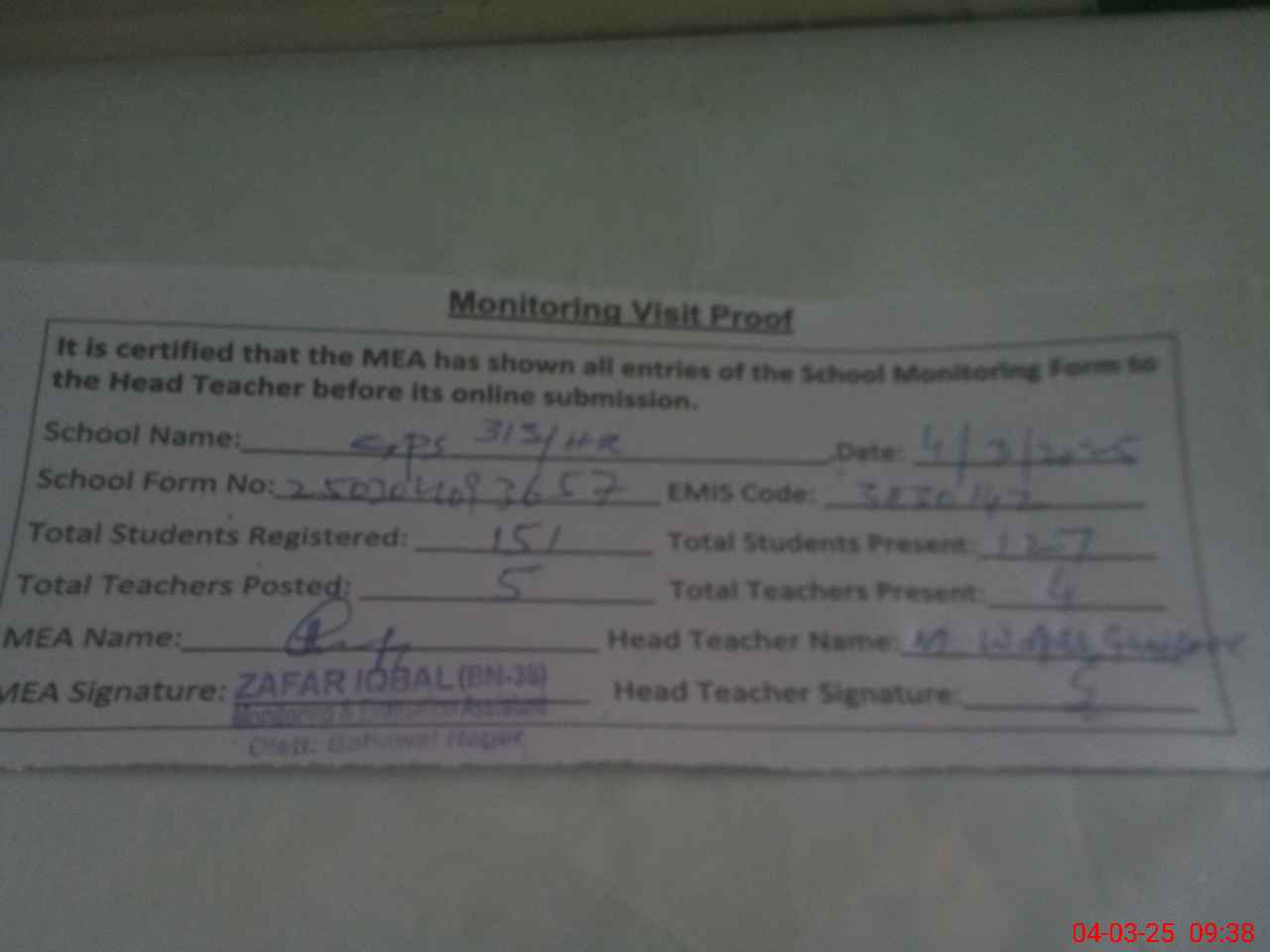 | EMIS Code: 31130142 | Name of School: GPS CHAK 313/HR | |||