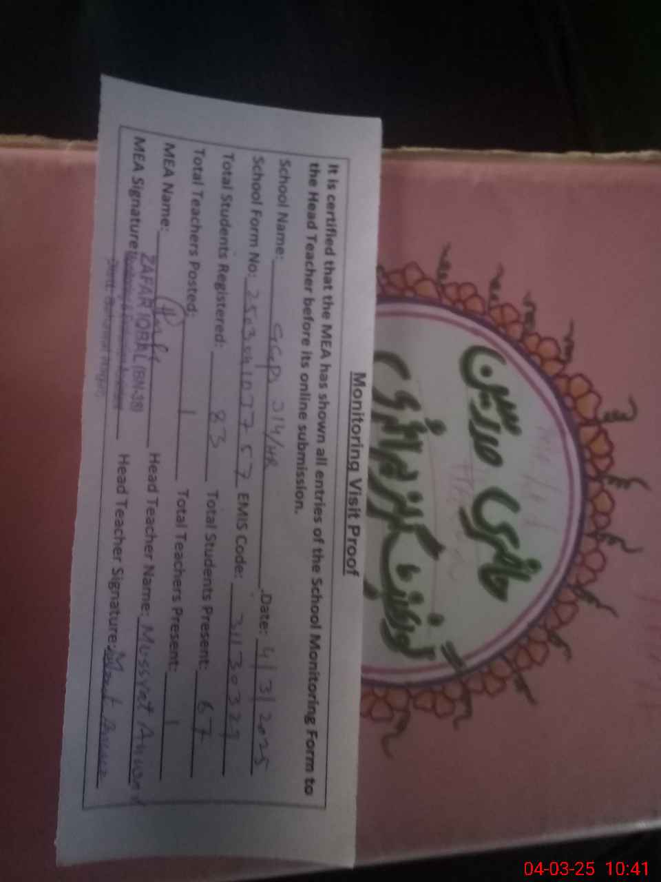 | Attendance Register | Head Teacher | MEA with School | Visit Proof |