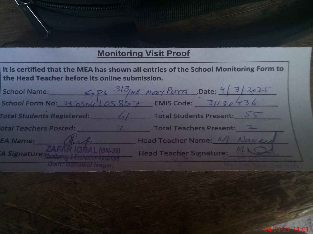 | Monitoring Date: 04-03-2025 | Start Time: 04-03-2025 10:53 AM | End Time: 04-03-2025 11:01 AM | Name of MEA: Za**** Iq**** BN**** | |