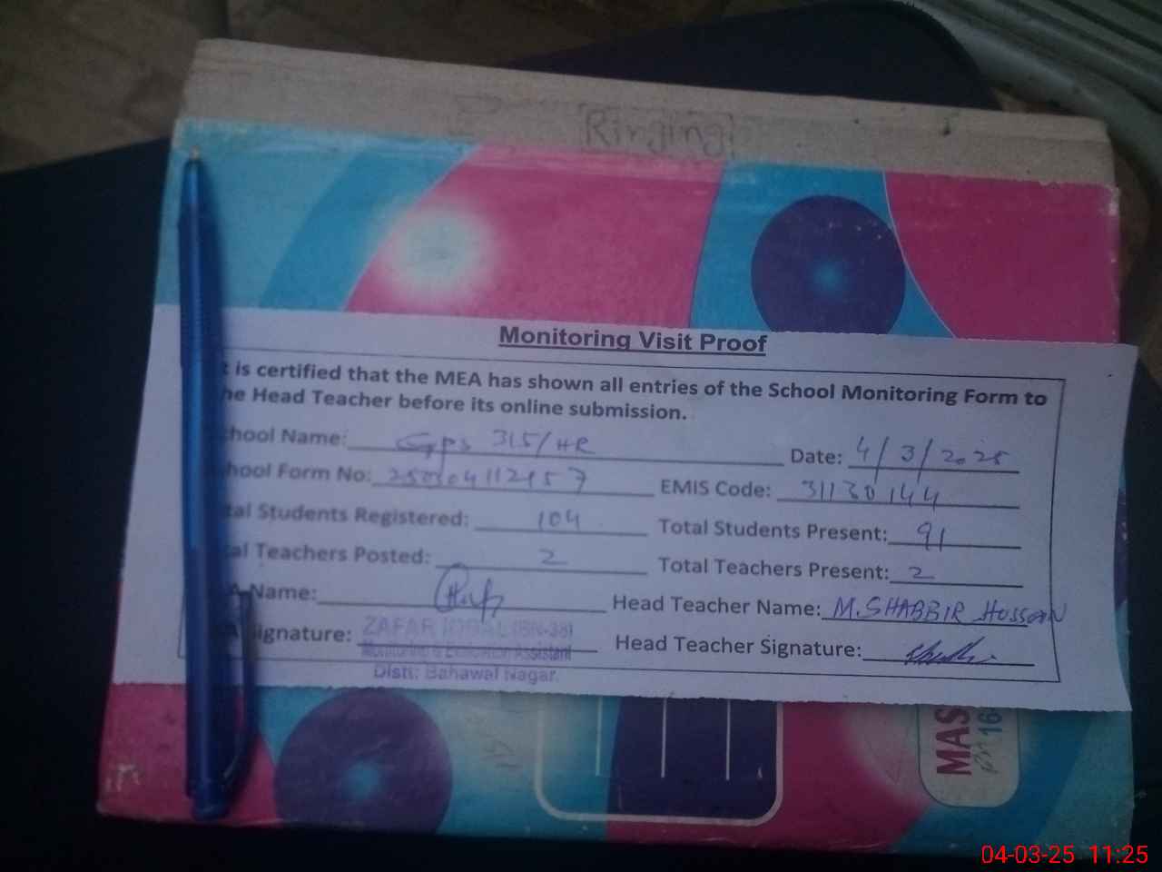 | Attendance Register | Head Teacher | MEA with School | Visit Proof |