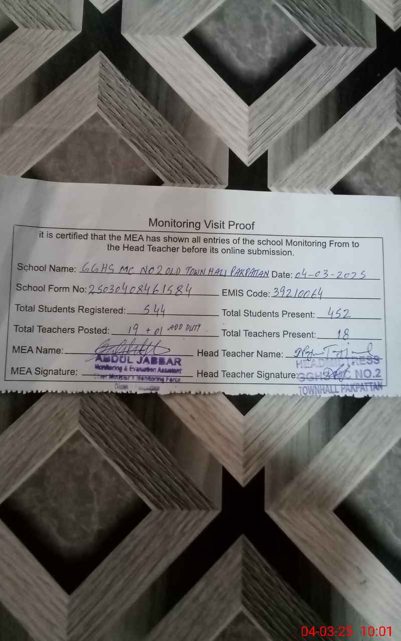 | EMIS Code: 39210064 | Name of School: GGHS MC NO. 2 OLD TOWN HALL PAKPATTAN | |||