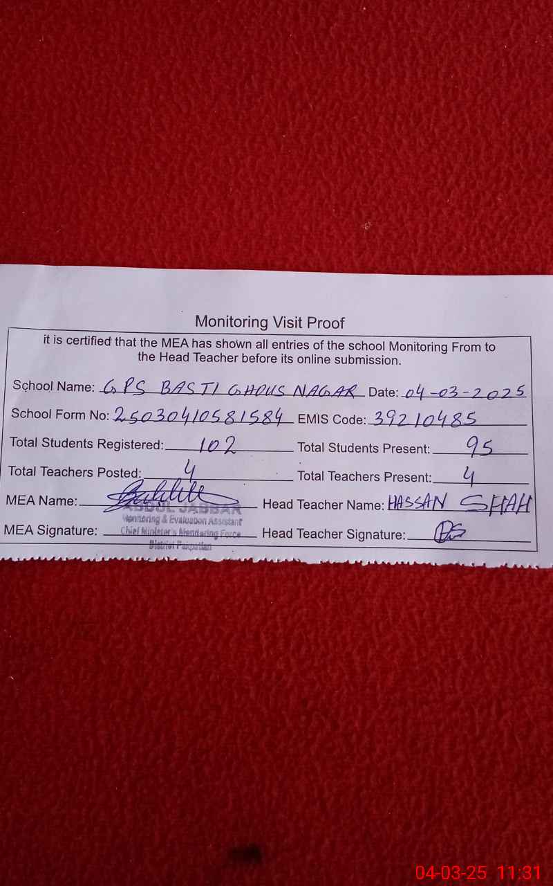 | EMIS Code: 39210485 | Name of School: GPS BASTI GHOUS NAGAR P/O PAKPATTAN | |||