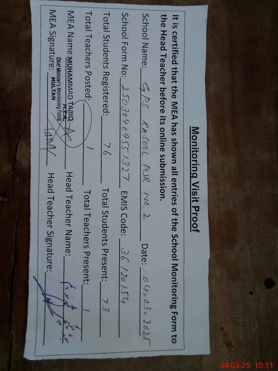 | EMIS Code: 36120154 | Name of School: GPS RASOOL PUR NO. 2 SHUJA ABAD | |||