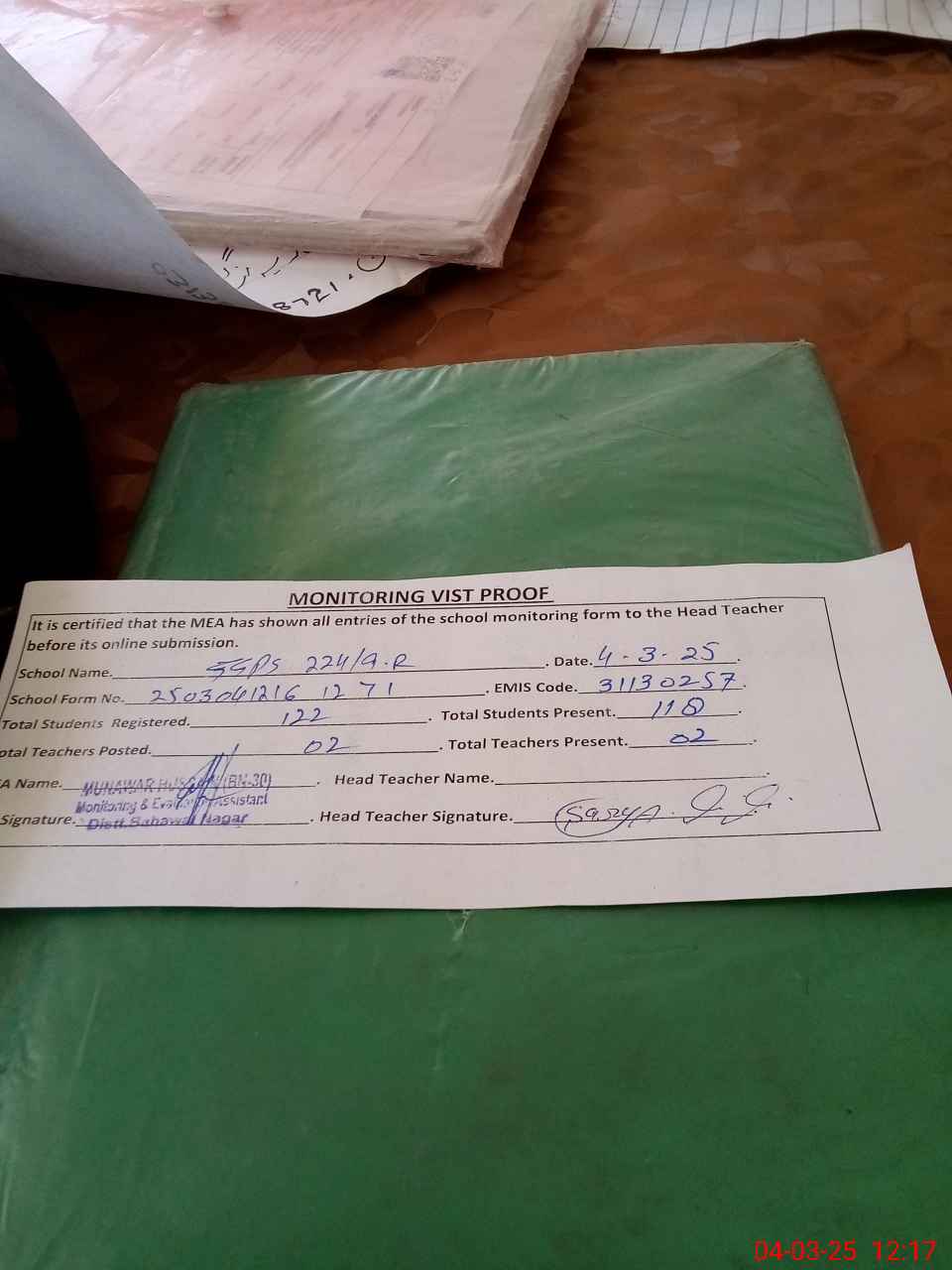| EMIS Code: 31130257 | Name of School: GGPS CHAK NO 224/9-R (S) | |||
