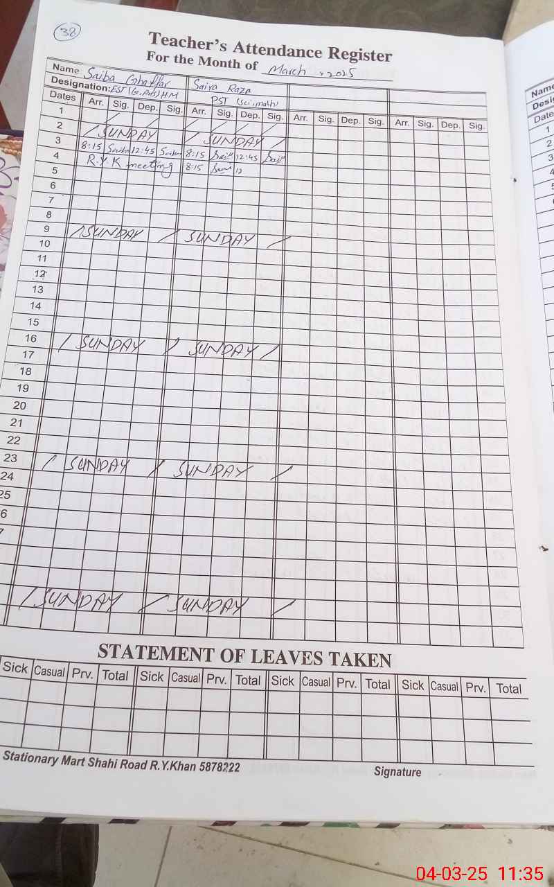 | 31**** | Sa**** Gh**** | EST | Regular | 0 | 0 | 0 | 0 | 0 | 0 | 0 | 0 | 0 | Absent (Un-Authorized) |