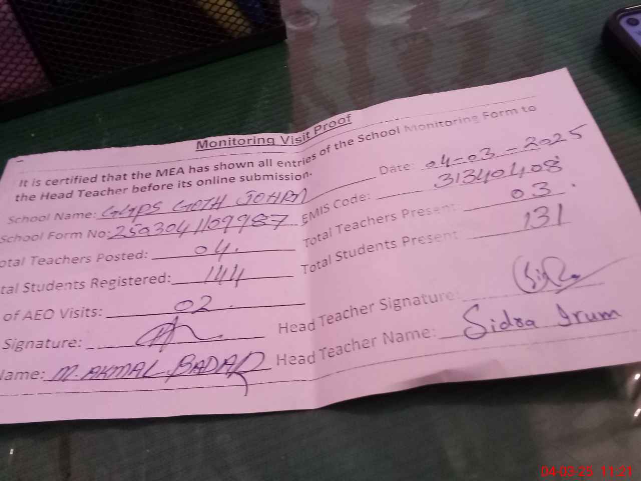 | EMIS Code: 31340408 | Name of School: GGPS GOTH JOHRA BASTI MASORIAN | |||