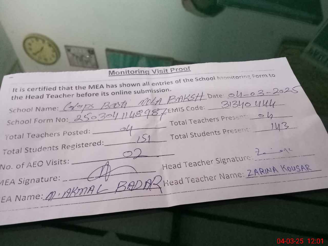 | EMIS Code: 31340444 | Name of School: GGPS BASTI MOLA BUKHSH | |||