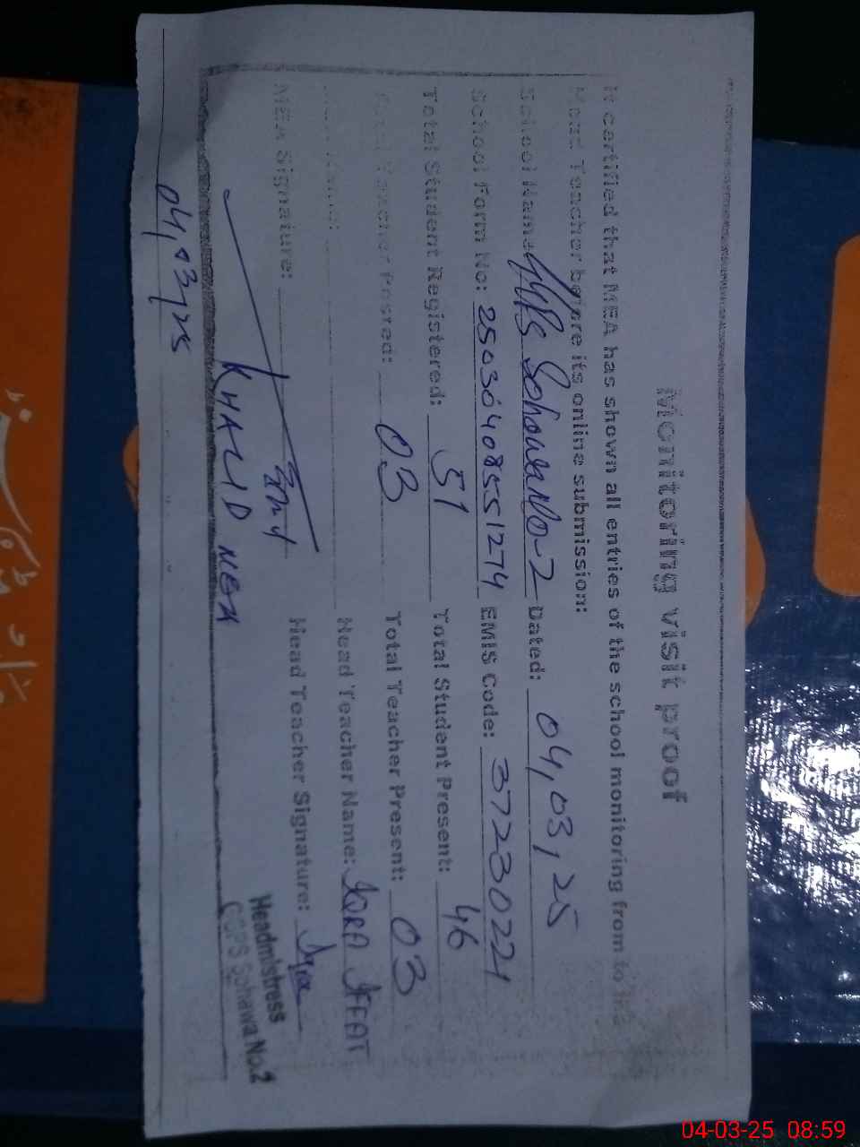 | Attendance Register | Head Teacher | MEA with School | Visit Proof |