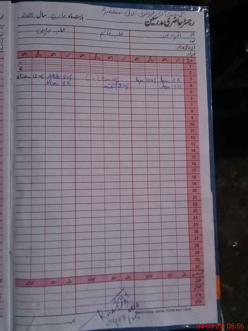 | CNIC | Full Name | Designation | R/C | Absence During Last Calender Month |