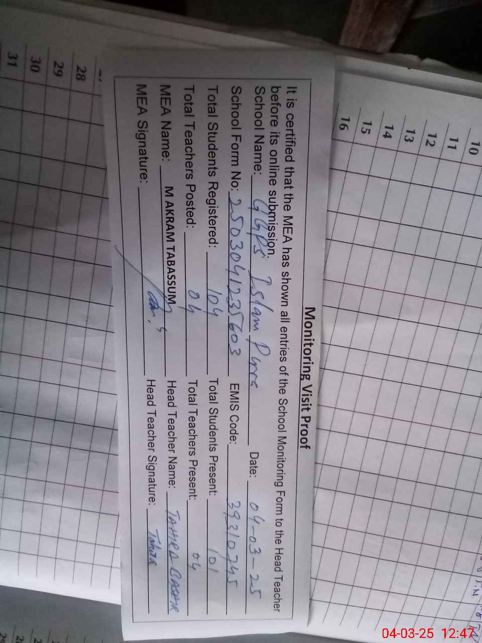| EMIS Code: 39310745 | Name of School: GGPS ISLAM PURA | |||