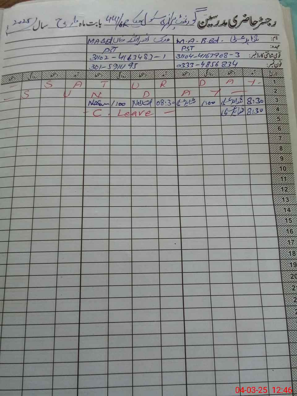 | Name: Sh**** Al**** Designation: (School Headmaster's/Headmistress's) PST Phone/Cell Number: 03**** |