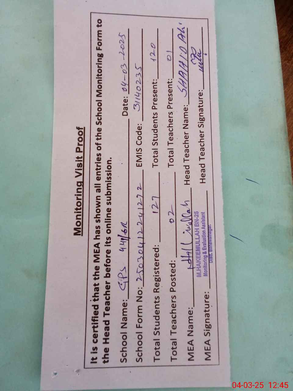 | Attendance Register | Head Teacher | MEA with School | Visit Proof |