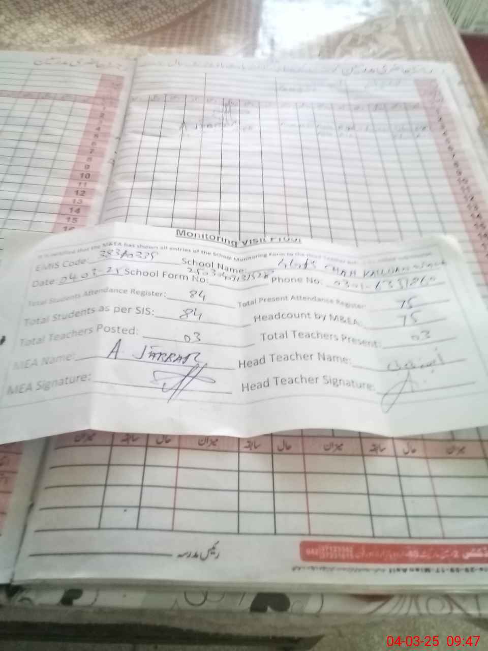 | Attendance Register | Head Teacher | MEA with School | Visit Proof |