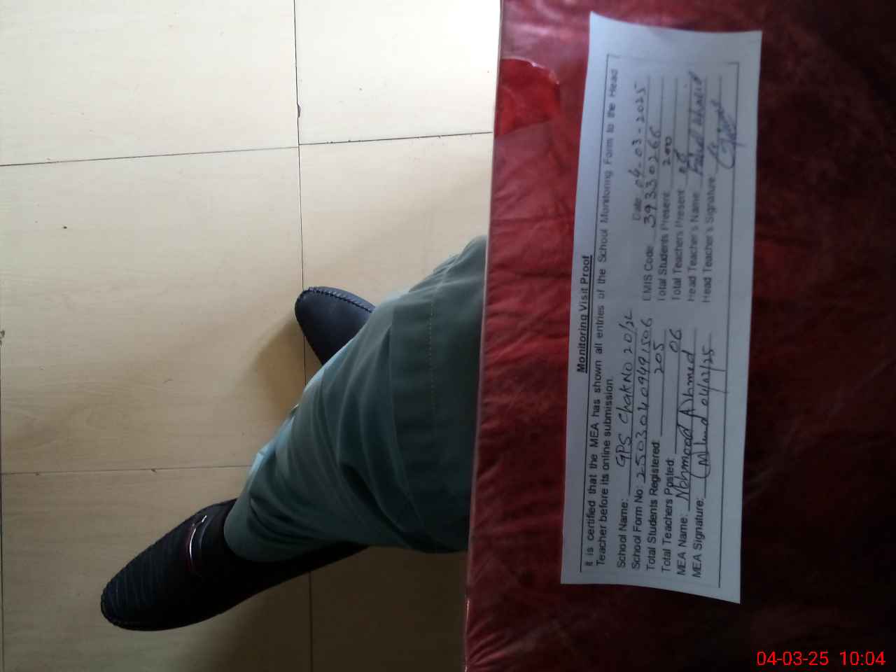 | Attendance Register | Head Teacher | MEA with School | Visit Proof |
