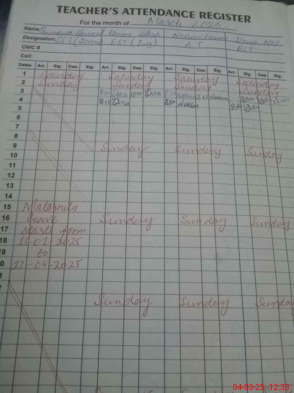 | 35**** | Su**** Ha**** | Regular | 28 | 0 | 0 | 28 | 0 | 0 | 0 | 0 | 0 | Maternity | |