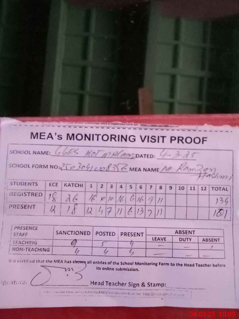 | Attendance Register | Head Teacher | MEA with School | Visit Proof |