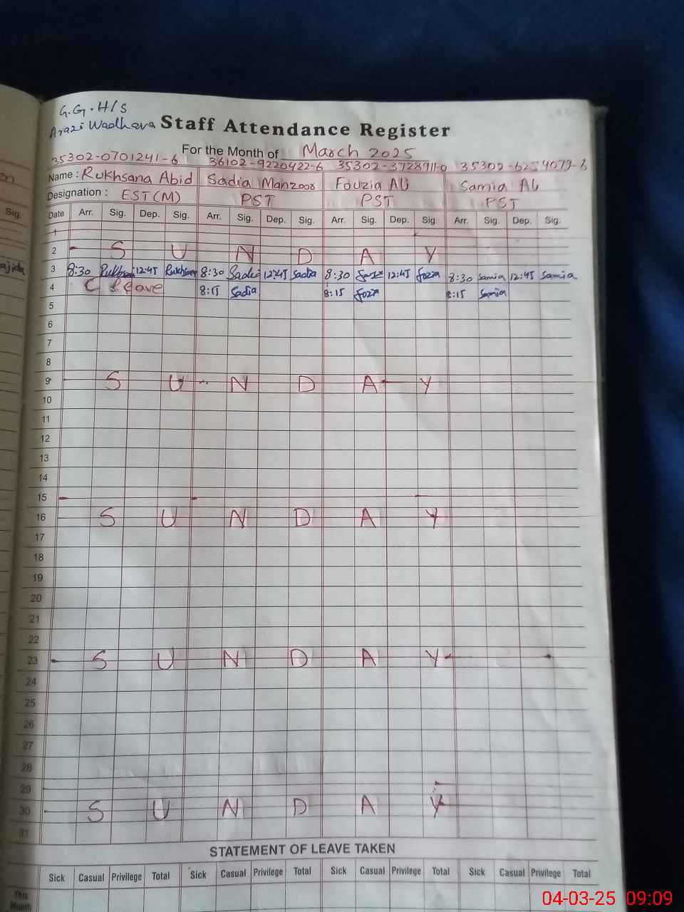 | Remarks (Use Separate Page if Required): 01 PST Female teacher named Samia Ali attached from GPS wan mauta to GGHS Arazi Wadhwa since 09 Oct 24 | |||||