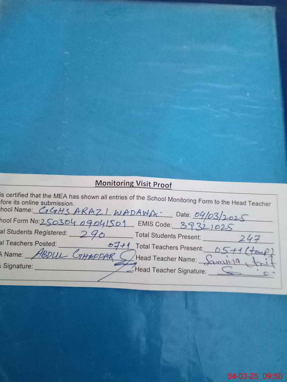| EMIS Code: 39321025 | Name of School: GGHS ARAZI WADHAVA | |||