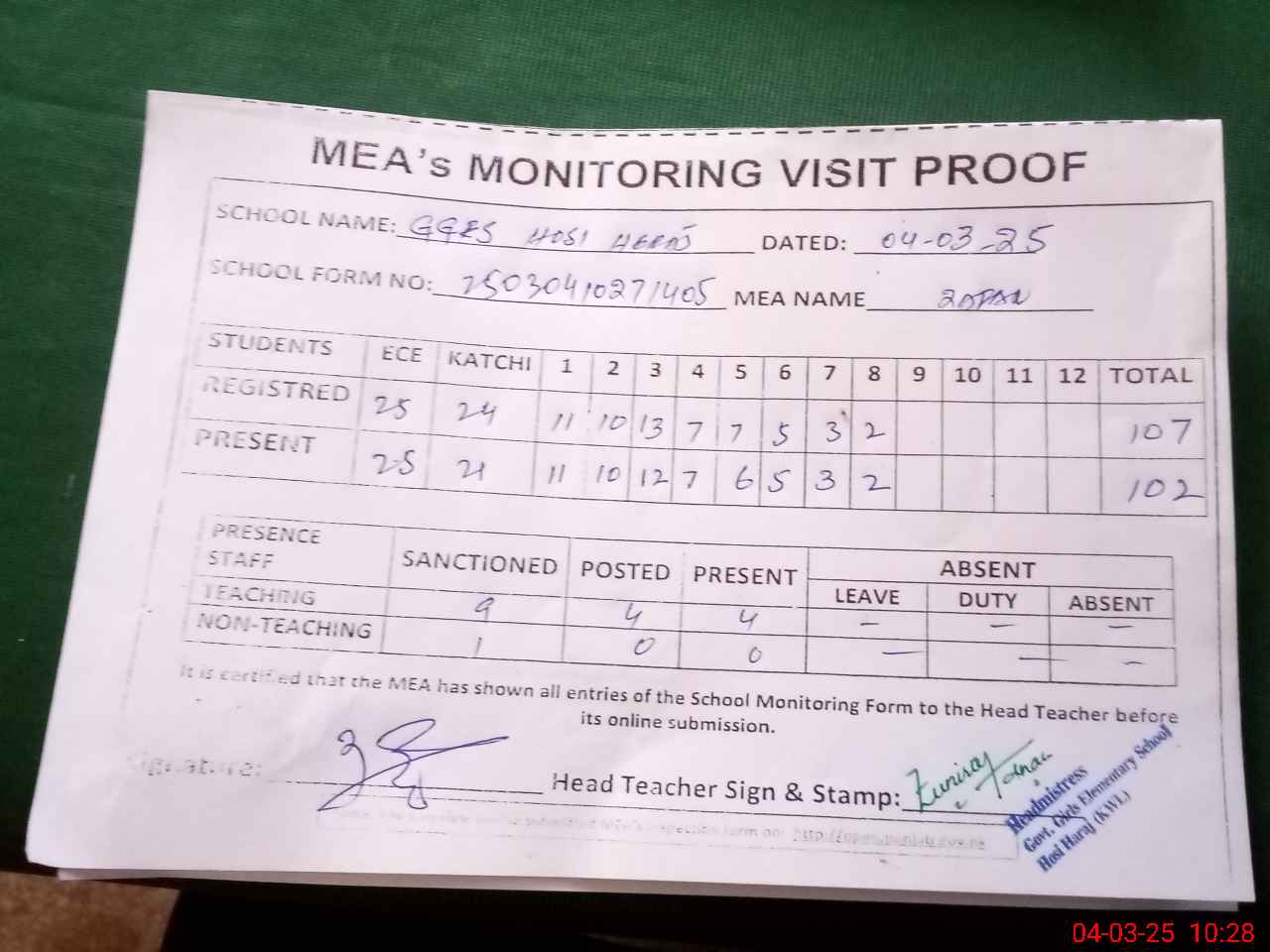 | Attendance Register | Head Teacher | MEA with School | Visit Proof |