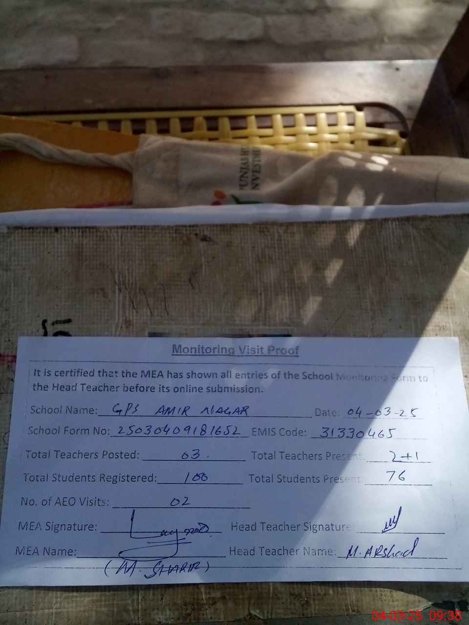 | Attendance Register | Head Teacher | MEA with School | Visit Proof |