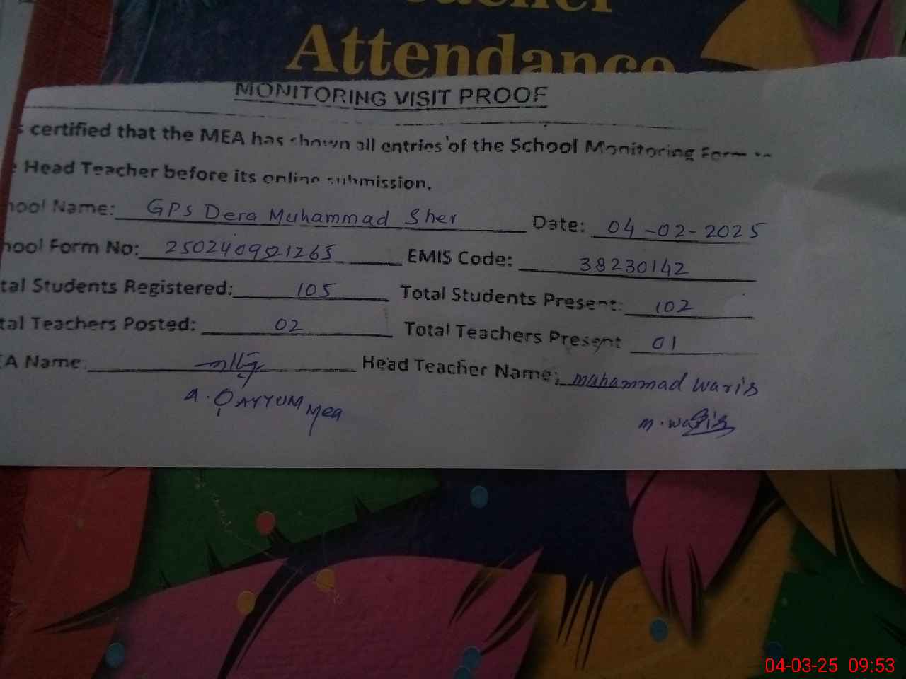 | EMIS Code: 38230142 | Name of School: GPS DERA MUHAMMAD SHER | |||