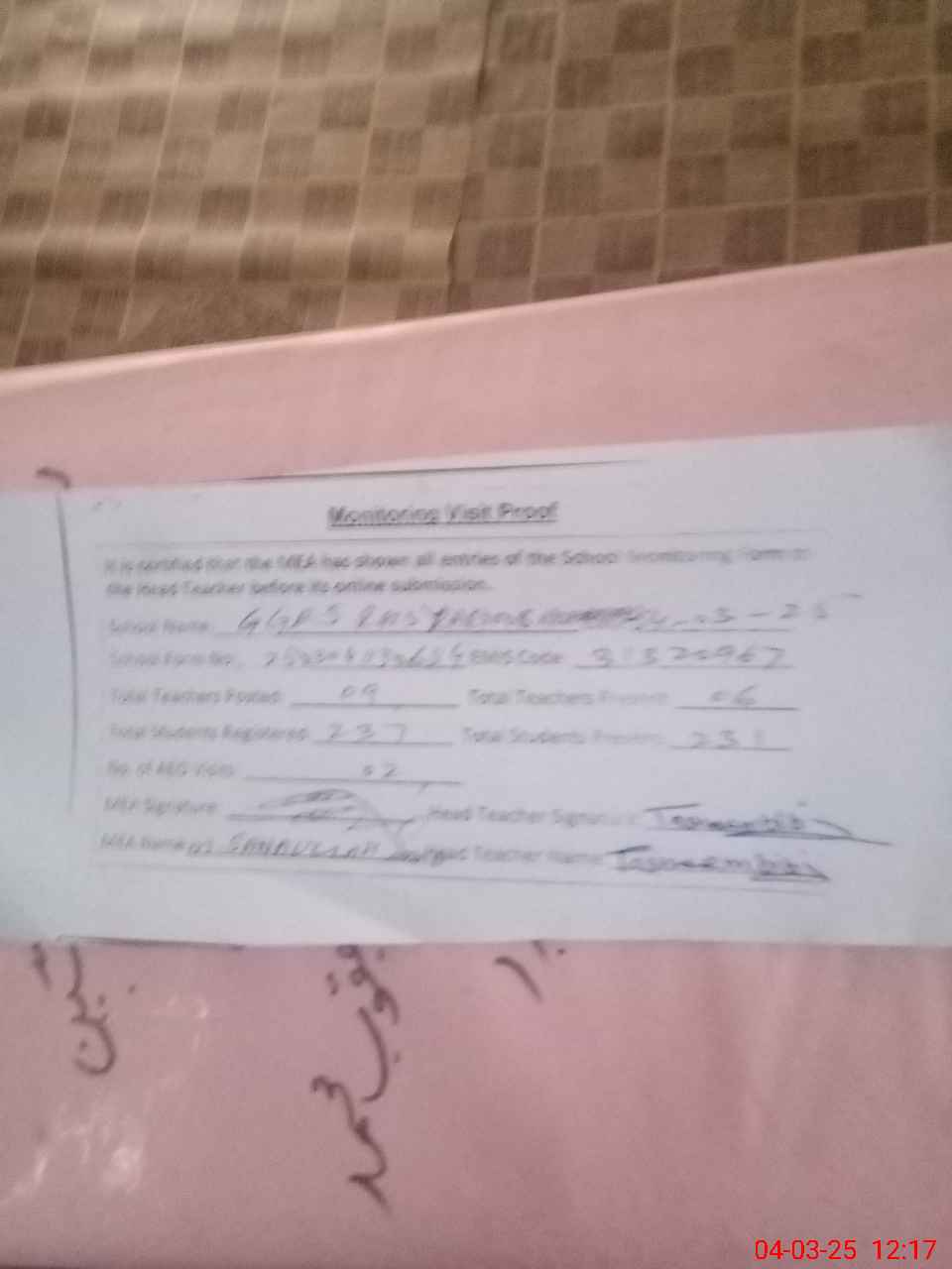 | Attendance Register | Head Teacher | MEA with School | Visit Proof |