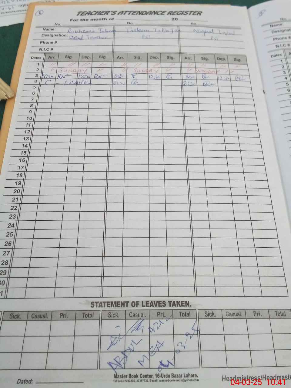 | Remarks (Use Separate Page if Required): PST RUKHSANA JABEEN is physical absent On Leave record not available NSB and FTF record not available | |||||