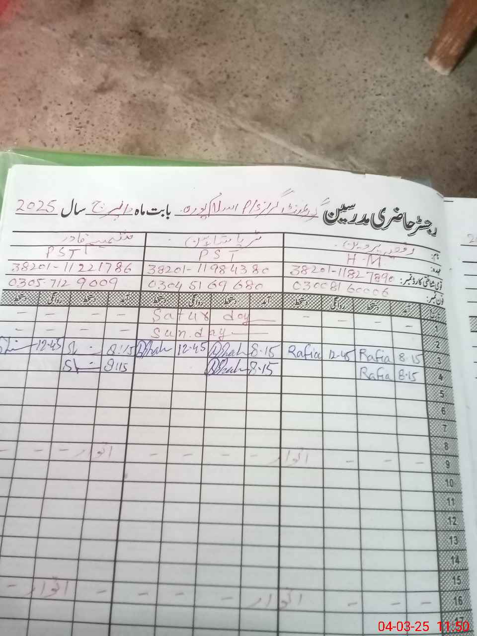 | CNIC | Full Name | Designation | R/C | Absence During Last Calender Month |