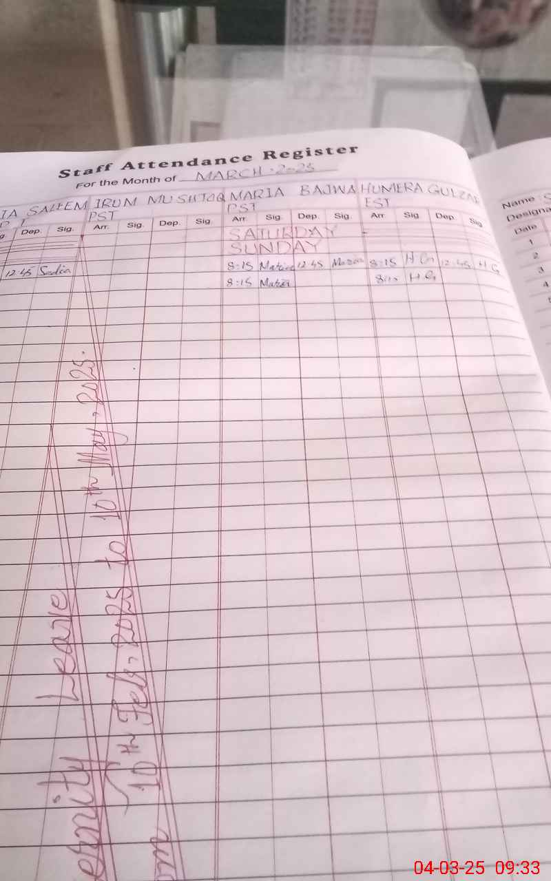 | CNIC | Full Name | Designation | R/C | Absence During Last Calender Month |