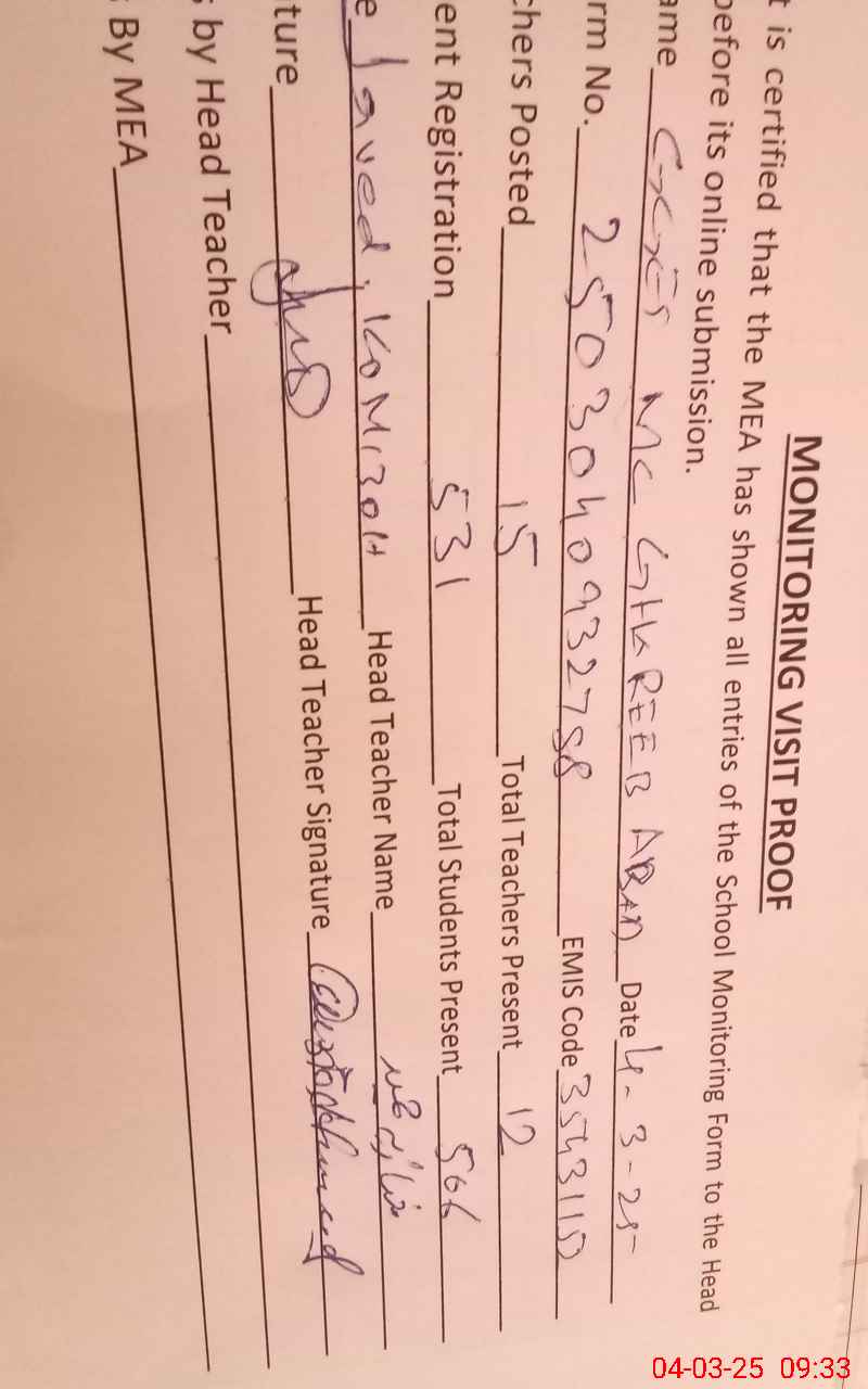 | Attendance Register | Head Teacher | MEA with School | Visit Proof |