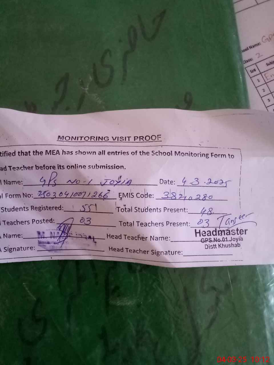 | Attendance Register | Head Teacher | MEA with School | Visit Proof |